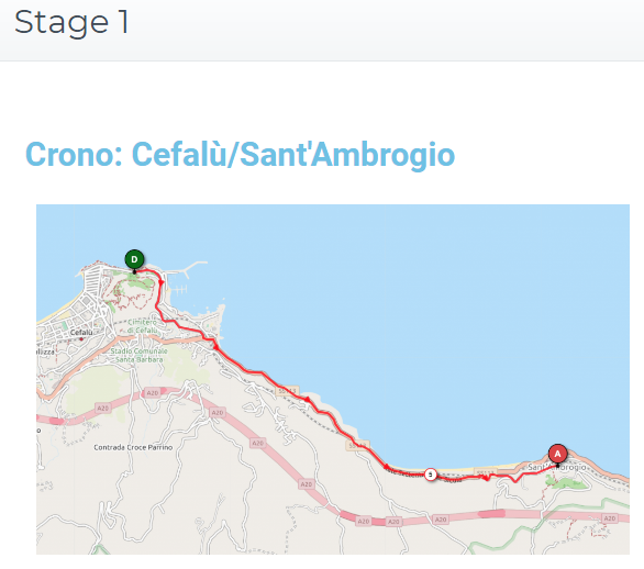 tappa ore 09:00 stage 3 – 85,00 Km STAGE 1 – CRONO IN LINEA 17 -04-2021 • Ciclismo – Strada • Cefalù -> Sant’Ambrogio ore 10:00 a.m. • 7.2 km, dsl 80 m, dalle ore 09,00 alle ore 09,30 Raduno via Del Faro – Cefalù (PA) dalle ore 10,00 ingresso in griglia via Del Faro – Cefalù (PA) alle ore 10,15 in punto di Sabato 17 Aprile 2021 partenza dallo stesso luogo; Arrivo alle ore 12,30 Sant’Ambrogio – (Pa)
